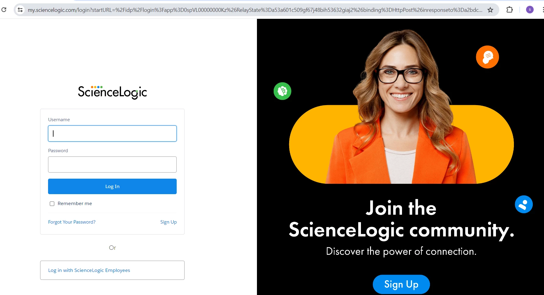 The ScienceLogic Support Center (support.sciencelogic.com), ScienceLogic Nexus Community (community.sciencelogic.com), and ScienceLogic Training (sciencelogic-university.litmos.com) all use a common username and password. Once you are logged in to the ScienceLogic Customer Identity site, you can login to the different sites automatically.