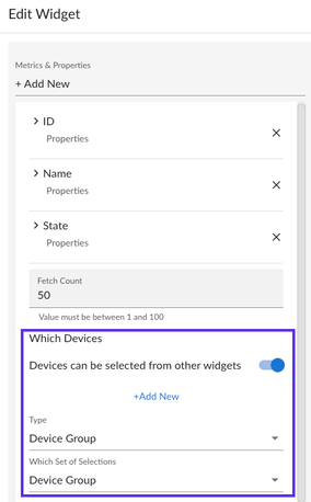 A device group widget configured for This widget can drive other widgets, should certainly be capable of driving a device widget configured with Devices can be selected from other widgets set to context Type of "Device Group".
