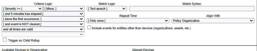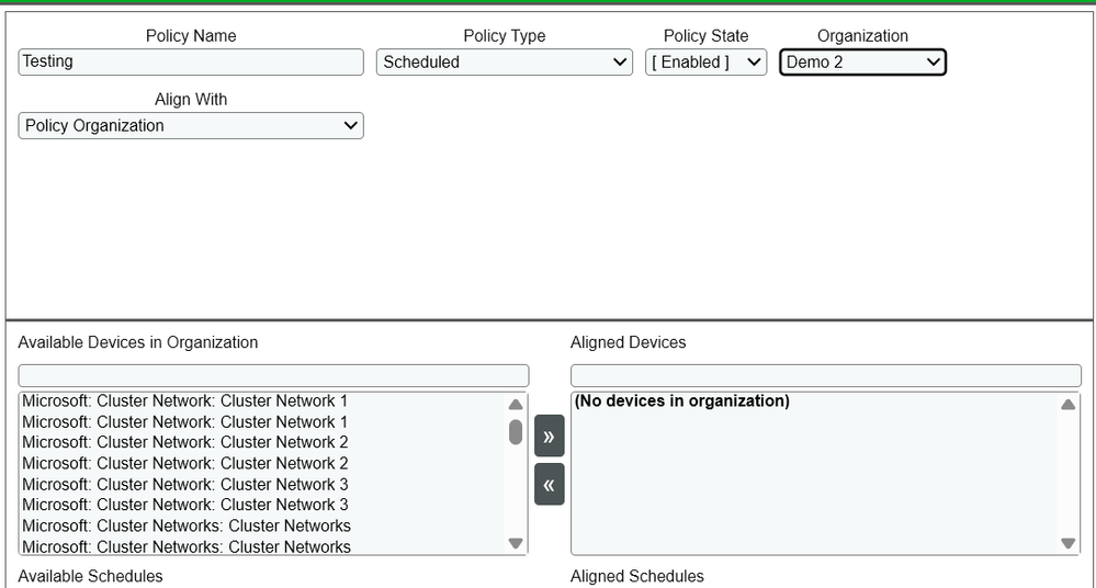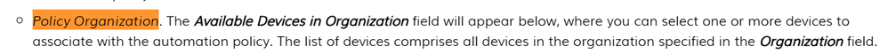 When creating automation policy, there is an option for selecting the Organization for where it "belongs", but still one needs to select devices from the device list, otherwise there is "no devices in organization" in Aligned Devices list.