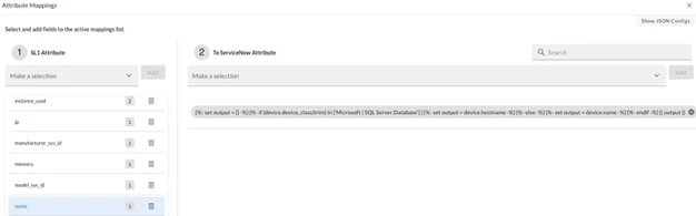 This excerpt of code would go under attribute mappings for name on the ScienceLogic side mapping to name on the ServiceNow side: