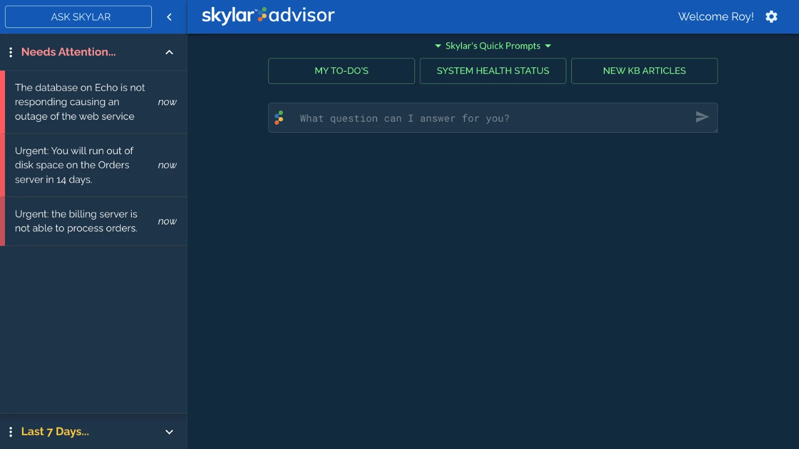 The concept of Skylar Advisor is that instead of a skilled user having to always know what questions to ask of the tool, the Advisor automatically tells the user the answers to the curated questions tailored to the user role without the user having to even ask them in the first place!