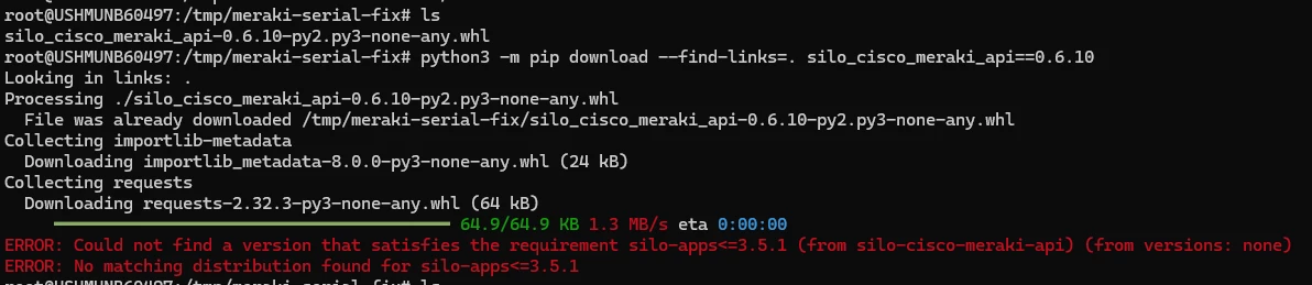 I was able to get the Library downloaded, unpacked, extracted the individual .py file using 'wheel unpack [file]', made the change, and ran 'wheel pack [directory]'. The final step as outlined in this SL document is to re-package the python project using the command 'python3 -m pip download --find-links=. silo_cisco_meraki_api==0.6.10'. However, when I run this I'm getting the error: